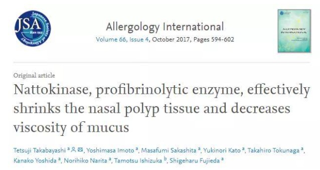 장기간의 염증은 비강 점막에 과도한 피브린 침착을 유발하는데, 이는 만성 부비동염의 원인 중 하나이며 비강 폴립 형성을 촉진하기도 합니다. 일본 연구진의 연구 결과에 따르면 낫토키나아제는 피브린을 분해하여 비강 폴립 조직을 효과적으로 축소시킬 수 있습니다. 또한, 만성 부비동염 환자와 천식 환자의 비점액 및 가래의 점도가 낫토키나아제 용액에 담근 후 유의미하게 감소하는 것으로 나타났습니다.